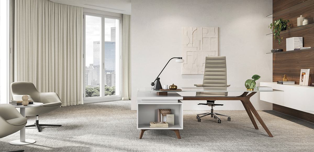 Hauptelement: Der Tisch/Schreibtisch Glas, mit Gestell aus Vollholz. Eine klares Statement, fast eine Herausforderung an die verbreitete Tendenz, nur Industriepro- duktionen zu verwenden. DR von Frezza spricht von Liebe zum handwerklichen Produkt und zum authentischen Material: dem Holz.