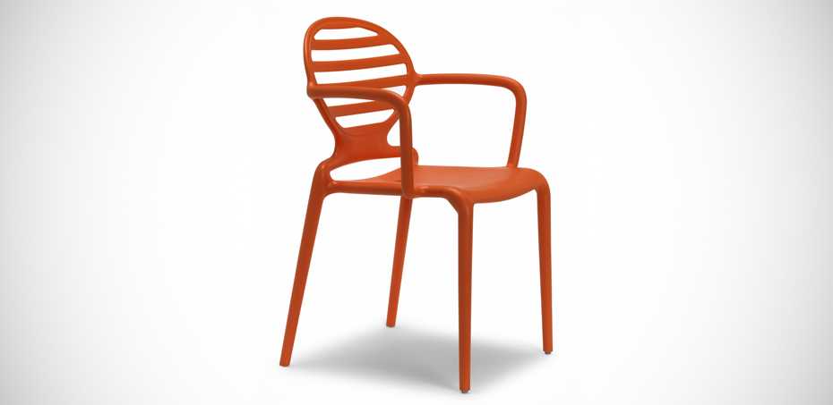 Der Designer-Stuhl Cokka von Scab Design besitzt eine Struktur aus Polycarbonat, die im Injektionsverfahren mit „Air Moulding“-Technologie hergestellt wird, oder aus glasfaserverstärktem Polypropylen.